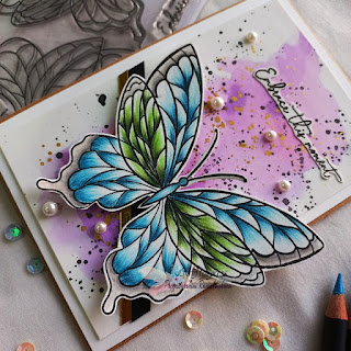The colouring practice turned into a card here. I found an amazing cardstock from Amazon and it works brilliantly with wax based pencils and watercolours and markers. I used Derwent colour pencils to colour the Butterfly. There are two images and I used the largest one and used blue and green to colour along with grey for the border. I enjoyed colouring the butterfly and its the perfect image. I took another piece of white cardstock and added some watercolours for the background. I splattered black ink and gold paint and added strip of gold and black cardstock. I added the sentiment, pearls and the image to a top fold note card.